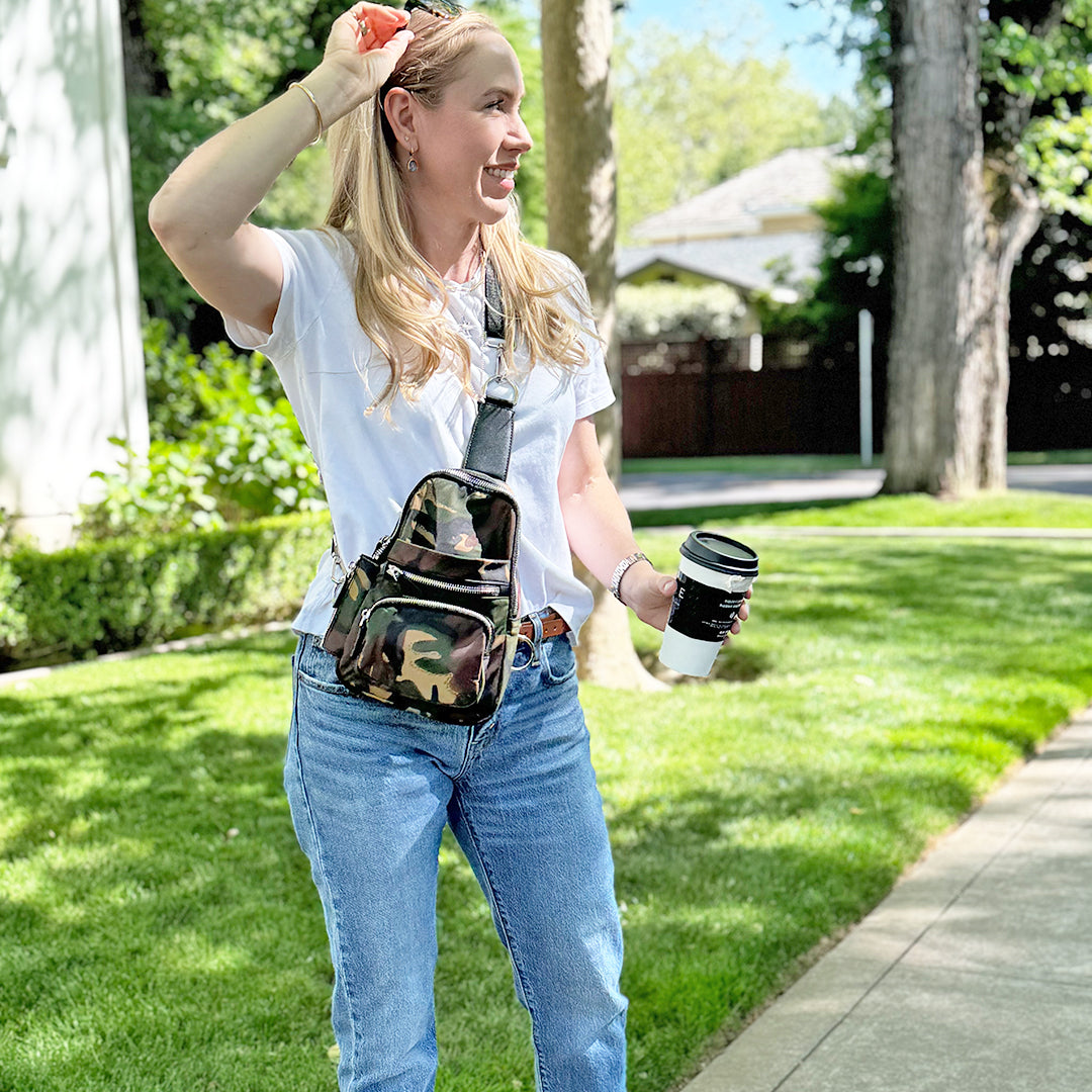 Say hello to the City Sling in Camo, your ultimate sidekick for those action-packed days and chaotic moments! 🌟 Designed to keep up with your everyday hustle and adventurous outings, it boasts a roomy main compartment with a handy interior zippered pocket. The standout camouflage pattern adds a rugged, stylish touch to your look, making sure you stand out with flair. Slip your phone into the front pocket for easy access, and stash your essentials in the two front zippered pockets. Plus, there's a hidden side pouch perfect for your 20oz water bottle, keeping you hydrated and hands-free all day long.